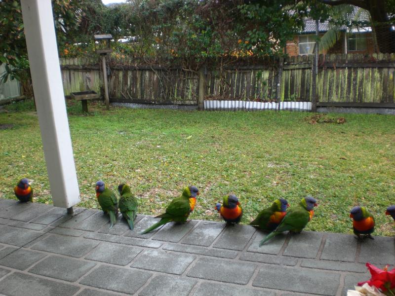 「ヴェランダにお客さんですよ」というのでカーテンを開けるとなんと大勢のお客さん。インコの仲間のレインボーロリキートたちです。人馴れしているのか、図太いのか、近くに寄っても逃げずに、手の中のエサをつつきにきます。鳴き声の騒々しさと、たまに車のルーフに糞をしてくれる割には何故か憎めない子たちです。陽光の中を飛ぶ際の羽毛、特にグリーンの眩さには目を見張ってしまいます。人気度も高い鳥です。